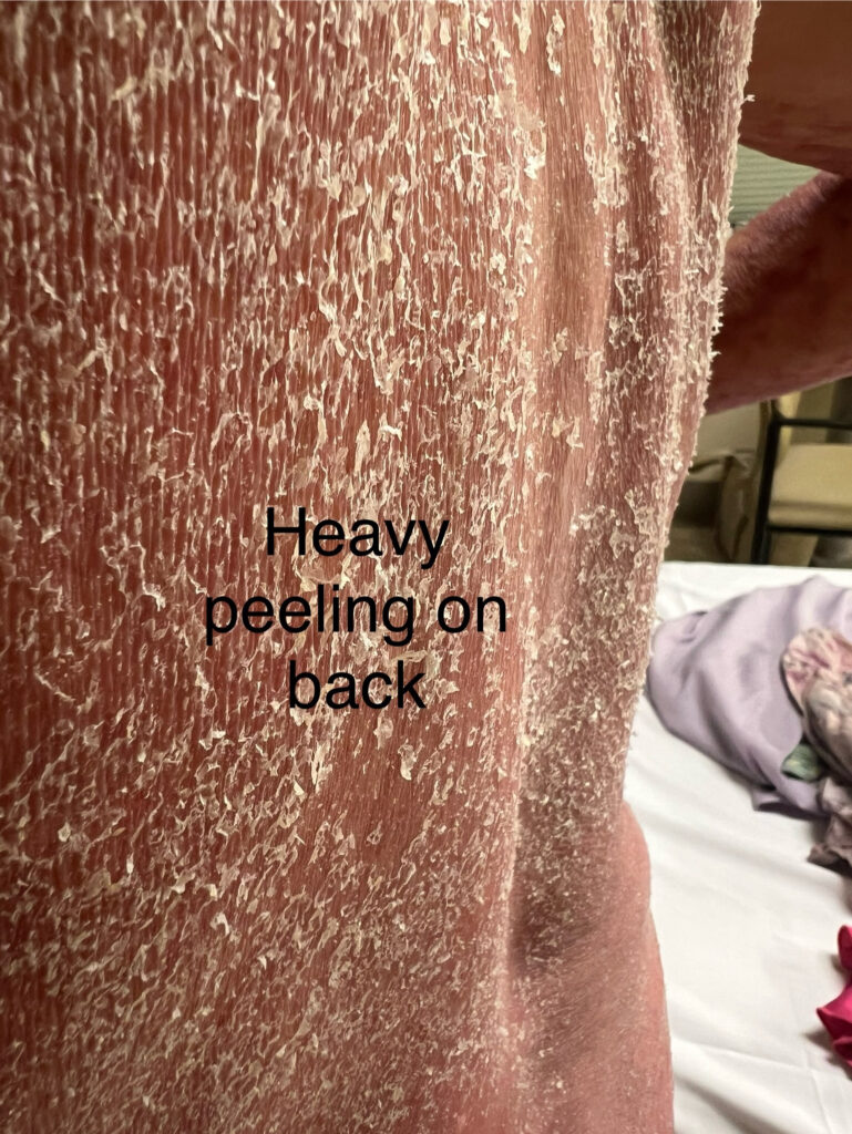 Bleach Bath: half a cup of Clorox in a bath tub with 8 inches of water. This seemed to help reduce peeling although not redness so much. It definitely kills bad bacteria and that helps prevent infection and seems to promote healing of cracked flaky skin. I was resistant to bleach baths at first because they seemed like they would be too drying. If I do them twice a week that works for me. I soak for 15 minutes in the tub and then shower off and apply creams promptly. It seems to work.