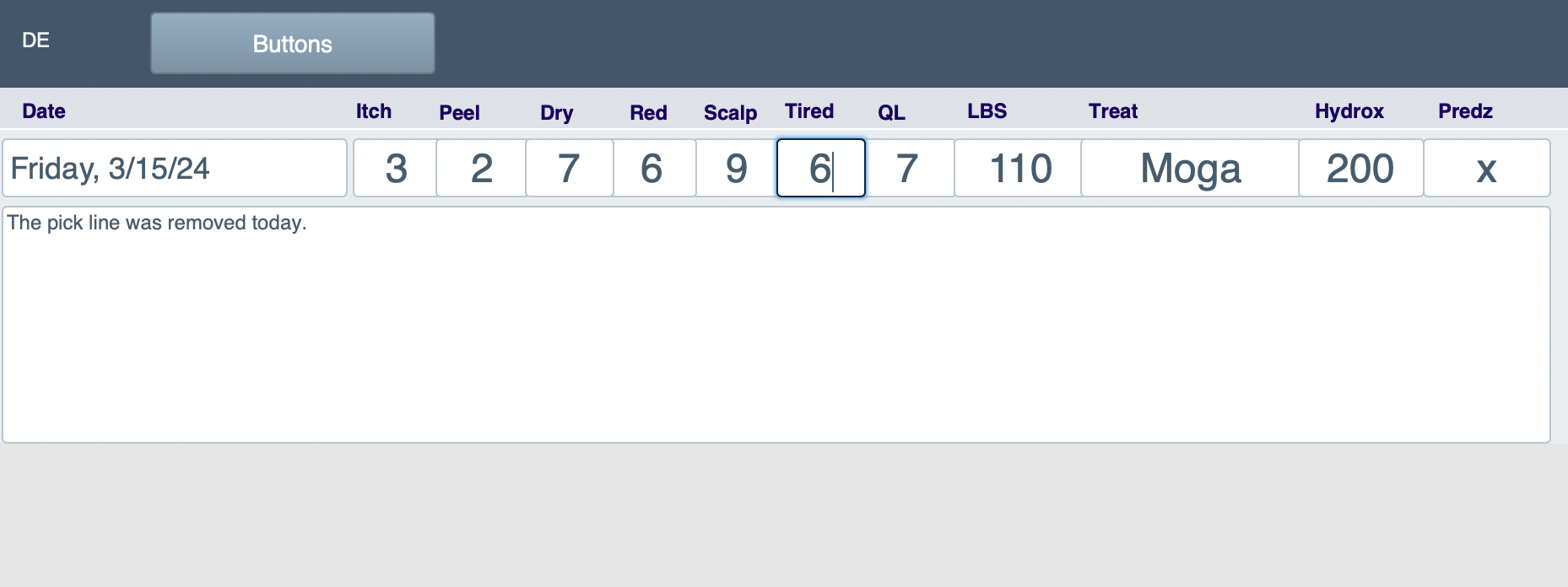 In addition to notebook, we keep a log on an iPad in a database. It took a while to refine what symptoms we should track. Itching, peeling, dry skin, and redness were obvious categories. But flaky itching scalp and tiredness were reverent too. And so was weight loss. QL refers to “Quality of Life,”, where 1 horrible, and 10 is able to function almost like a normal before Sezary. We never have a 10, but we do have 9’s. In the notes we usually mention whatever happened that day in terms of activities, etc., and also make note of any relevant Sezary issues.